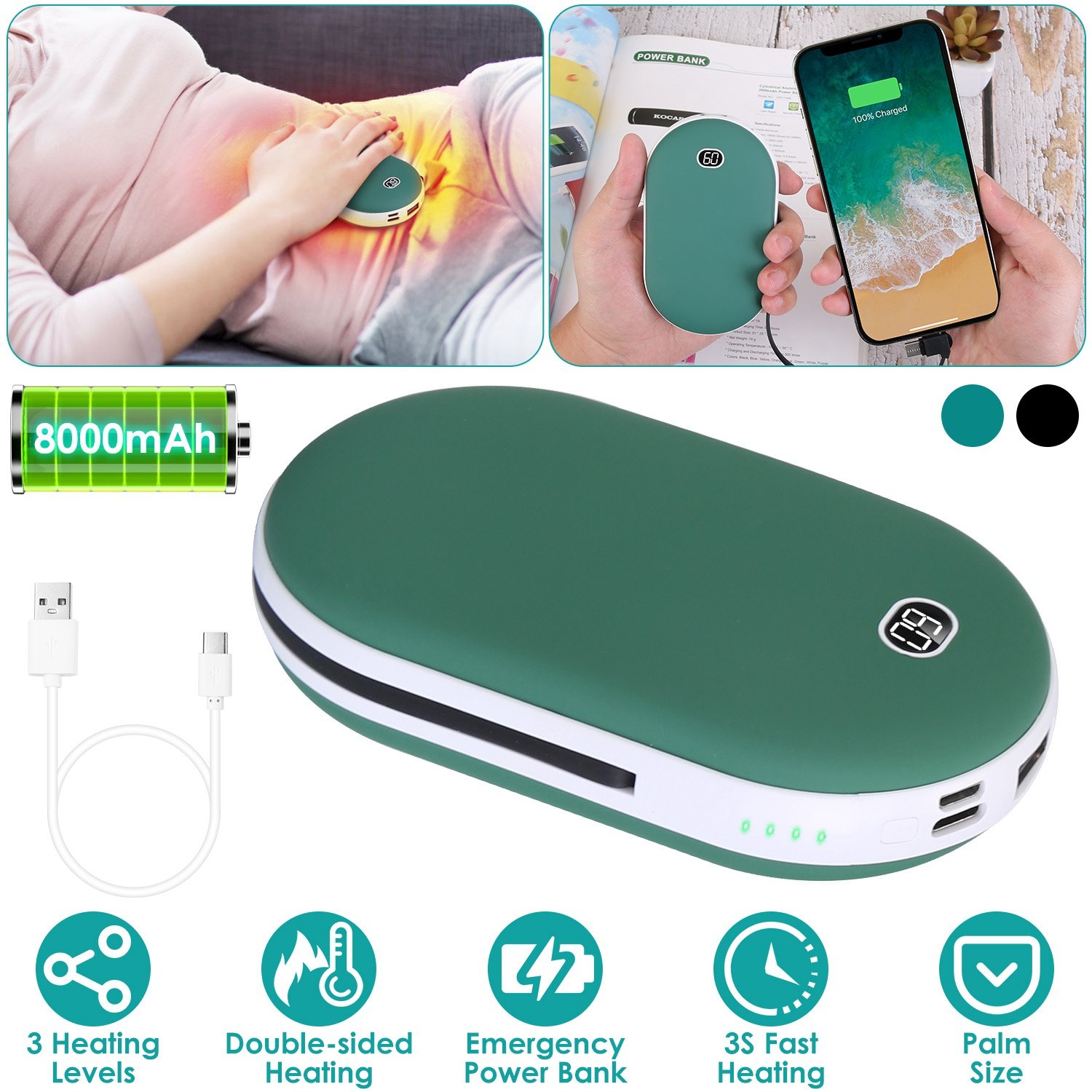Have your ever felt chilly cold as winter approaches? Try our electric hand warmer! Designed with double-sided heating and featured with 3 heating levels(113℉/122℉/140℉), our rechargeable hand warmer helps focus heat within 3S to warm up your hands, feet, knees, waist, and back. Also combines hand warmer and power bank, which can be used as a comfortable handwarmer in cold winter and a portable phone charger for emergency use. The inbult LT & Type-C cable and extra USB cable is for portable phone charging and self-charging. Features smart digital display and 4 indicator light to help you know about the realtime temperature and batery status. The USB rechargeable feature and compact size makes it an ideal companion for winter. Thoughtful gift for family, friends, lovers and colleagues.