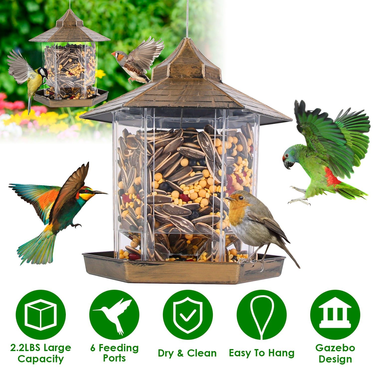 Are you a bird lover? Our gazebo wild bird feeder can hold up to 2.2lbs birdseed with hexagonal storage compartment and offers 6 feeding ports ensure that multiple birds can feed simultaneously. The 12 bottom drainage holes prevent water accumulation, keeping birdseed dry and fresh. Come with a sturdy iron cable passing from the bottom to the top, which allows itself to be securely attached to trees or poles. Twist open the top to refill seeds and lock to keep seeds dry and away from prying squirrels. Pavilion-shaped top and clear compartment, an attractive element to garden, patio, yard, park etc..