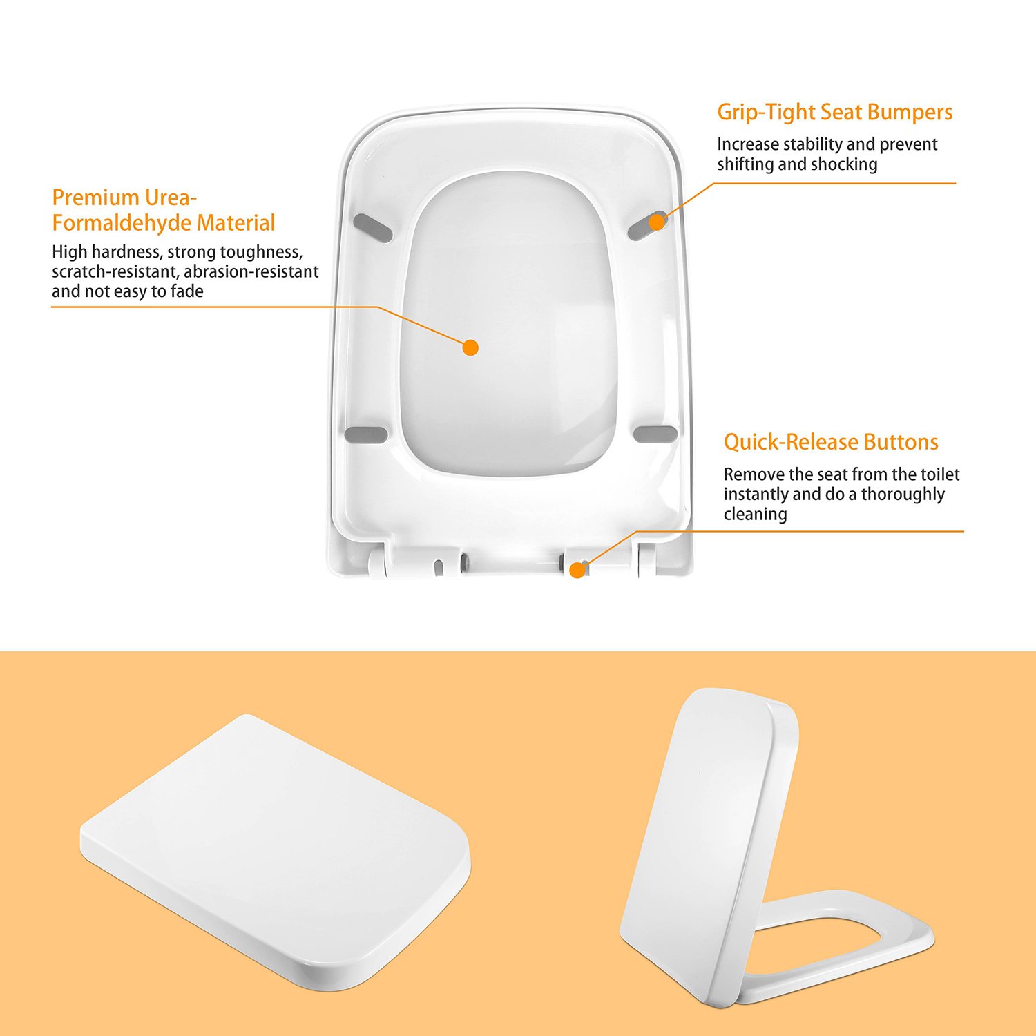Our square-shaped toilet seat (17.72in-L x 13.77in-W x 1.77in-H) is made from premium urea-formaldehyde materials, high hardness, strong toughness, scratch-resistant, abrasion-resistant and not easy to fade. Adopting slow-close design, it can be closed slowly to avoid loud slam, cracked toilets and pinched fingers. Additionally, it can be installed easily and securely with a set of quick-attach mounting accessories and removed instantly for a thorough cleaning with its designed quick-release buttons.