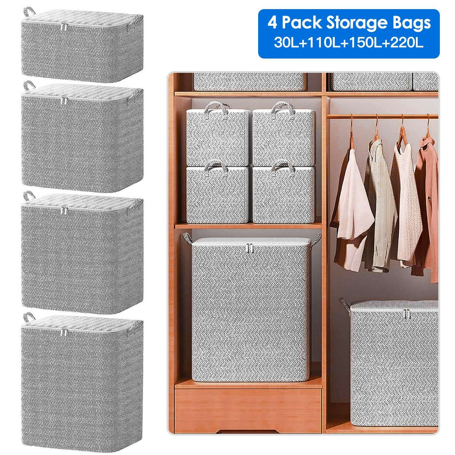 4 Pack Foldable Non Woven Storage Bags Closet Organizers Wardrobe Sorting Baskets with 2 Handles Dustproof Lid Zipper for Clothes Quilt 30L 110L 150L