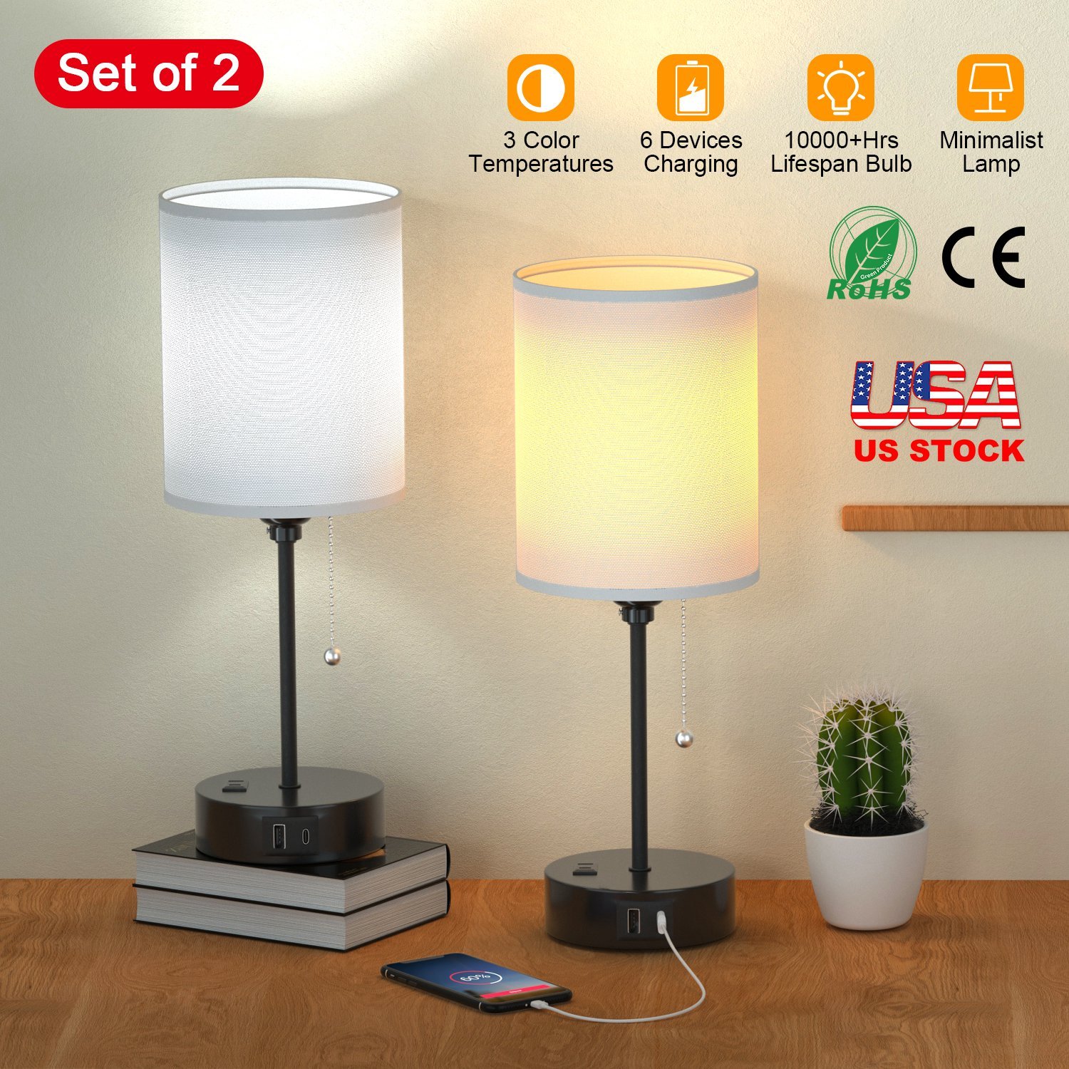 Home > 2Pcs Beside Lamps for Bedroom 3 Color Modes Nightstand Lamp USB C+A AC Output Ports Pull Chain E26 Bulb Light
