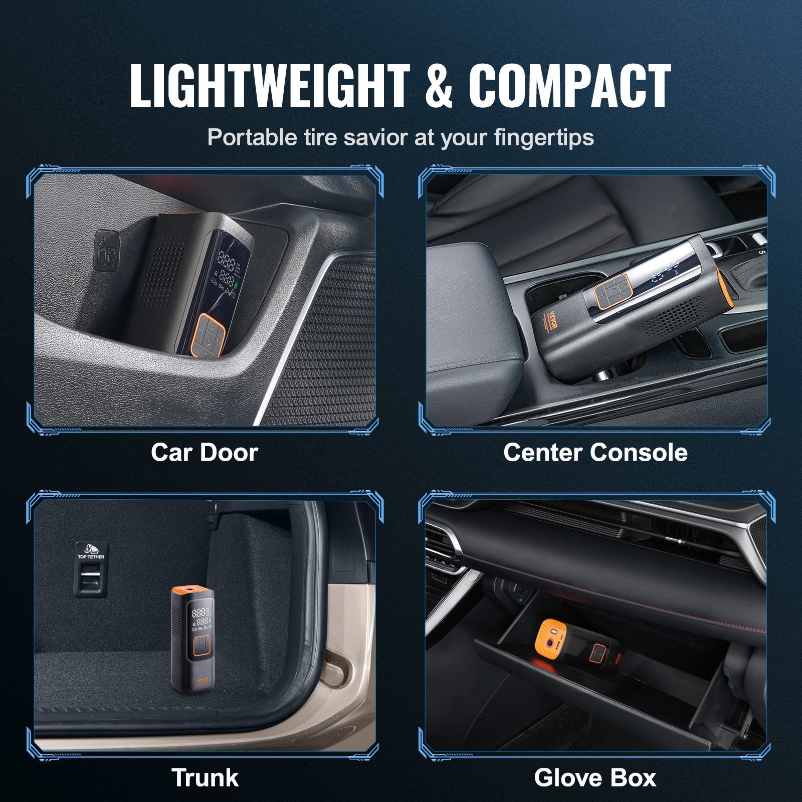 3.Small Yet Powerful: Pack it into the handy storage bag and take this lightweight 1.6LB air pump with you wherever you roam. This compact tire inflator easily fits in your vehicle's console, door pocket, or trunk . Convenience at your fingertips!